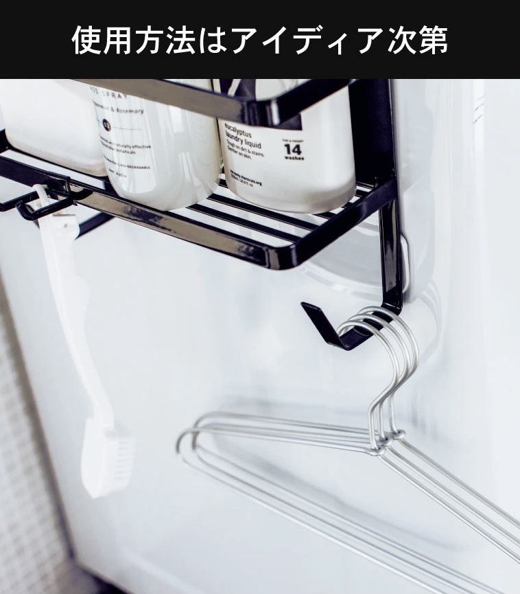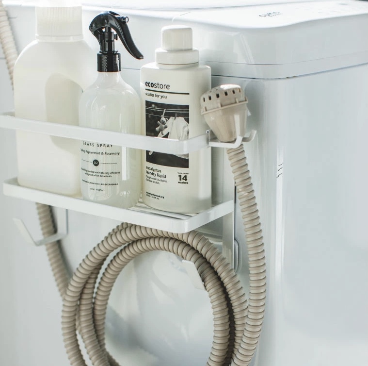 洗濯機横のデッドスペースを使ってランドリーアイテムをまとめて収納できるラック